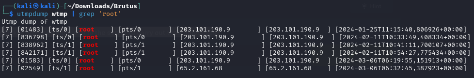 utmpdump wtmp - But we can filter by the username with which the attacker gained access, which in this case is what we are interested in: