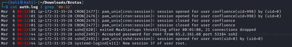 auth.logfile, we can see that access was gained with the userrootfrom the IP 65.2.161.68, which is the attacker’s IP as mentioned earlier.