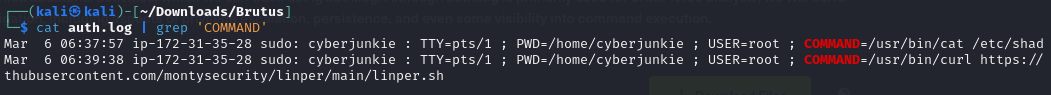 Task 8. The attacker logged into their backdoor account and utilized their higher privileges to download a script. What is the full command executed using sudo?