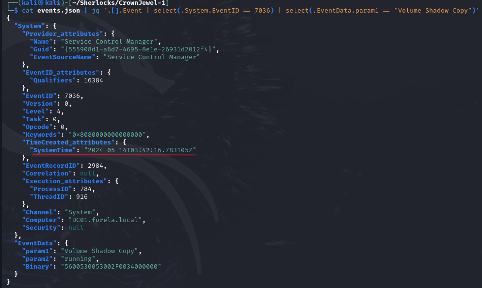 cat events.json | jq '.[].Event | select(.System.EventID == 7036) | select(.EventData.param1 == "Volume Shadow Copy")' - As a result, we will obtain the event we are looking for. Our answer is in the field