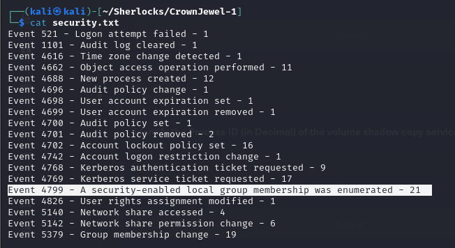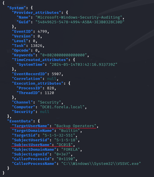 cat events.json | jq '.[].Event | select(.System.EventID == 4799) | select(.EventData.CallerProcessName == "C:\\Windows\\System32\\VSSVC.exe")' - We find different groups listed in the