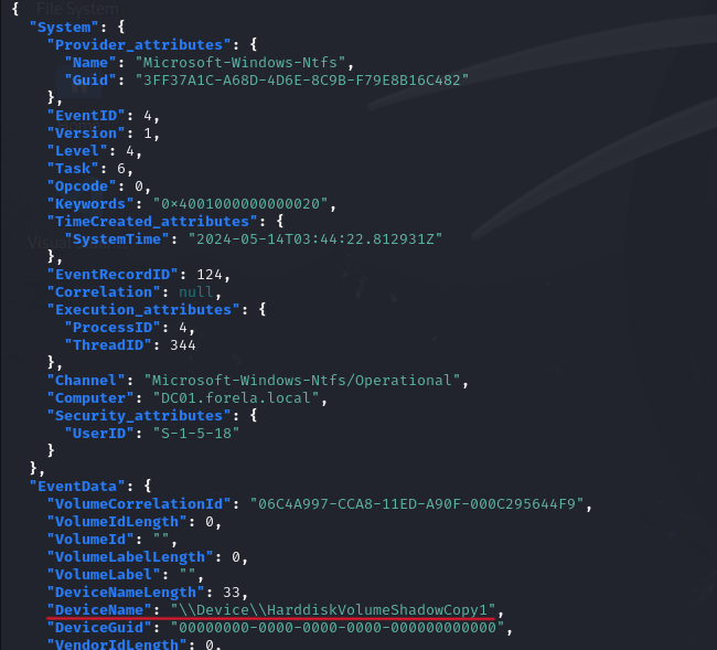| Scenario | Forela's domain controller is under attack. The Domain Administrator account is believed to be compromised, and it is suspected that the threat actor dumped the NTDS.dit database on the DC. We just received an alert of vssadmin being used on the DC, since this is not part of the routine schedule we have good reason to believe that the attacker abused this LOLBIN utility to get the Domain environment's crown jewel. Perform some analysis on provided artifacts for a quick triage and if possible kick the attacker as early as possible. |