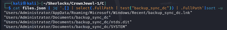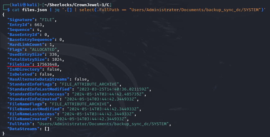 cat files.json | jq '.[] | select(.FullPath == "Users/Administrator/Documents/backup_sync_dc/ntds.dit") | .StandardInfoCreated' Task 7. A registry hive was also dumped alongside the NTDS database. Which registry hive was dumped and what is its file size in bytes?