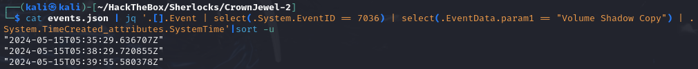 cat events.json | jq '.[].Event | select(.System.EventID == 7036) | select(.EventData.param1 == "Volume Shadow Copy") | .System.TimeCreated_attributes.SystemTime'|sort -u