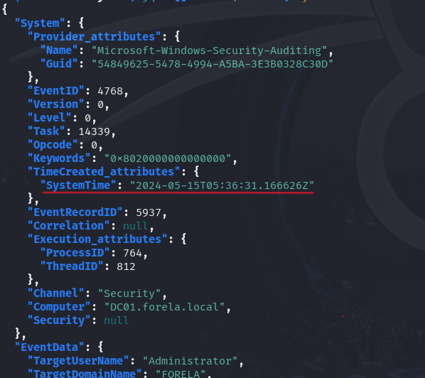cat events.json | jq '.[].Event | select(.System.EventID == 4768) | select(.EventData.TargetUserName == "Administrator")'