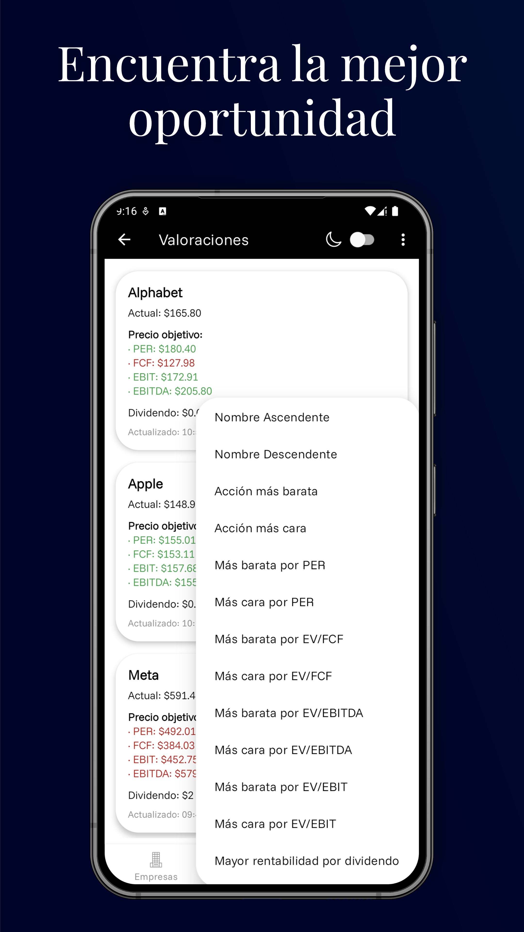 La aplicación puede calcular el precio objetivo de una acción, es decir, el valor que debería tener según sus datos financieros. Esto permite determinar el margen entre el precio actual del mercado y el precio objetivo, lo que facilita evaluar si una acción representa una buena oportunidad de inversión.